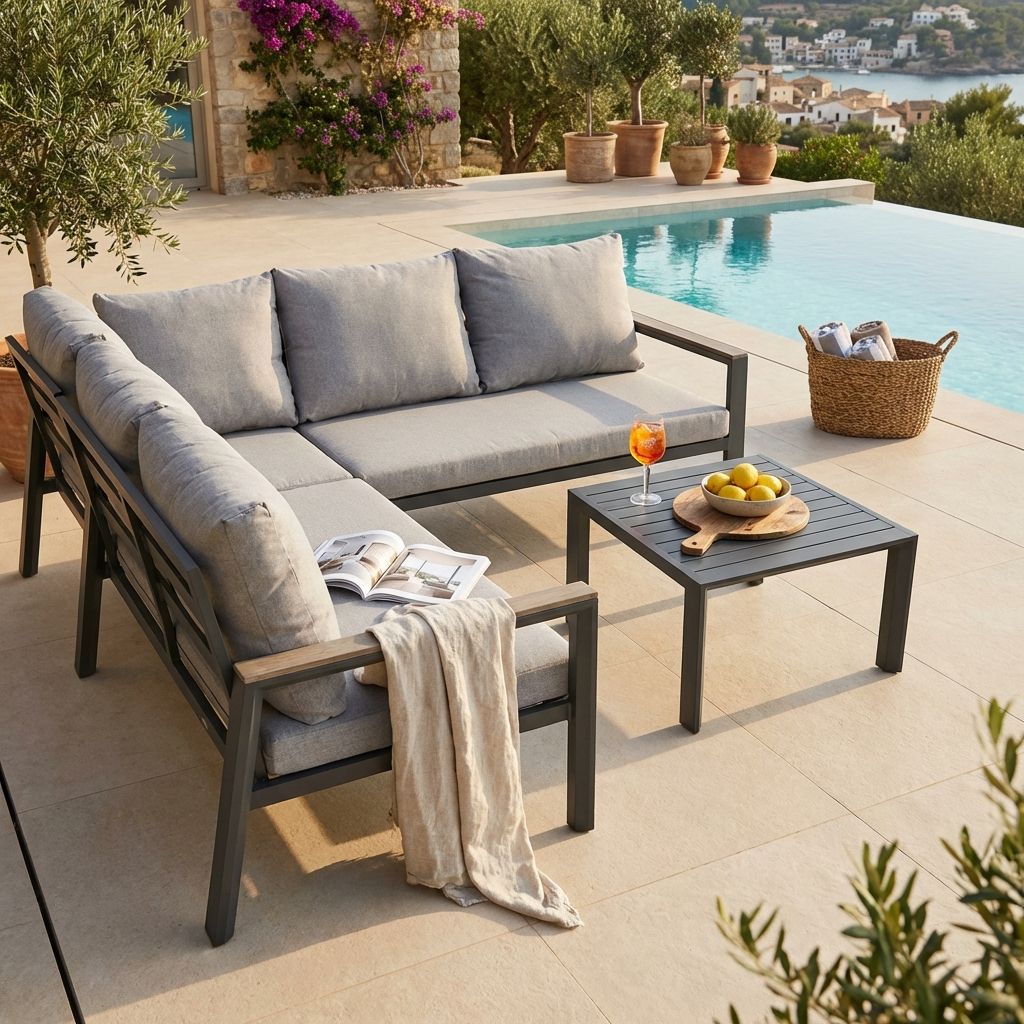 il divano o salotto angolare SUKARNO comodo ed elegante con struttura in alluminio e cuscini sfoderabili con braccioli in polywood viene realizzato in 2 classiche varianti bianco e antracite