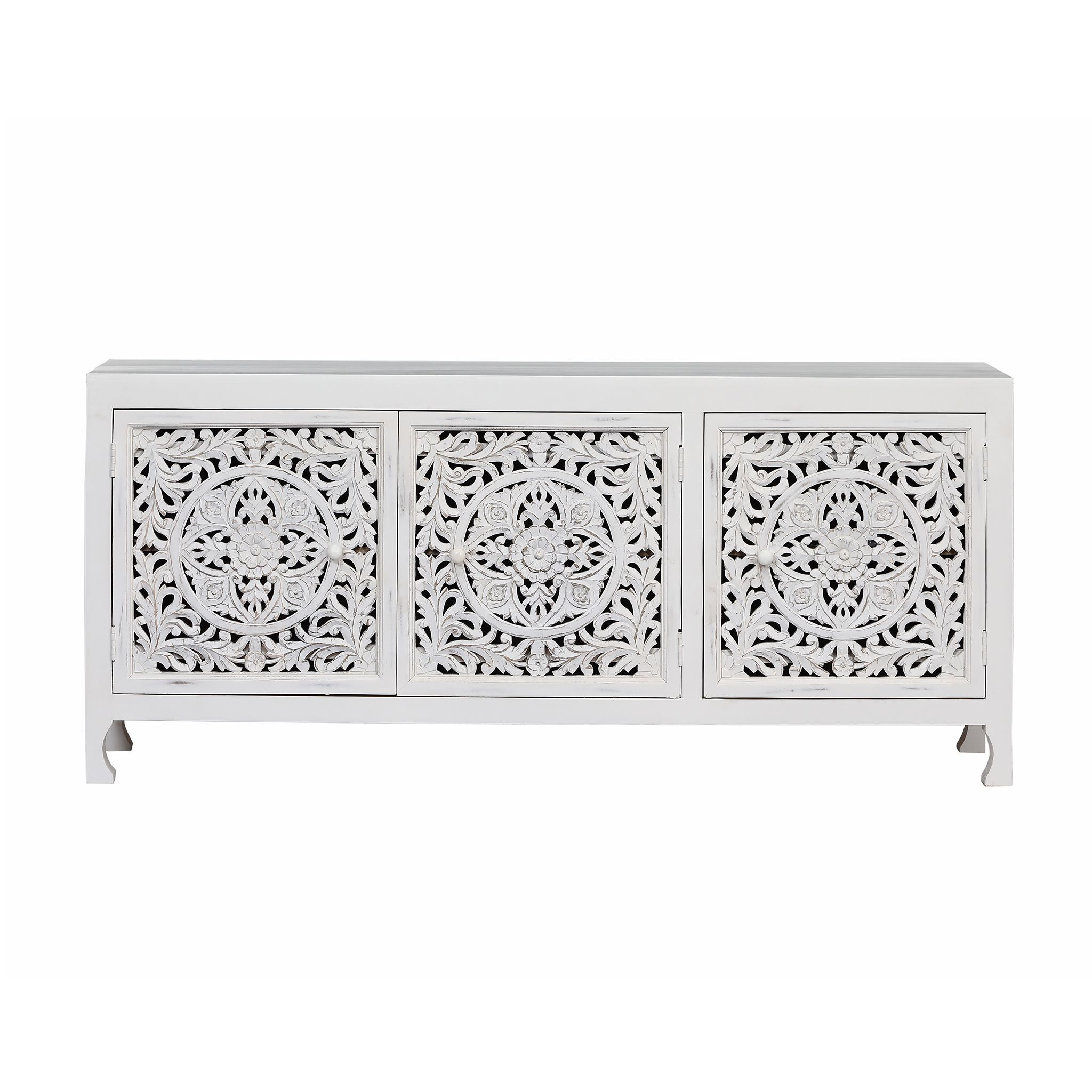 Realizzato in legno di mango, questo mobile incanta con il suo intaglio floreale e il delicato finish bianco anticato. Le ante traforate rivelano un’anima elegante e senza tempo, perfetta per ambienti shabby, boho e classici. Spazioso e raffinato, unisce estetica e funzionalità con il calore del legno naturale all’interno.