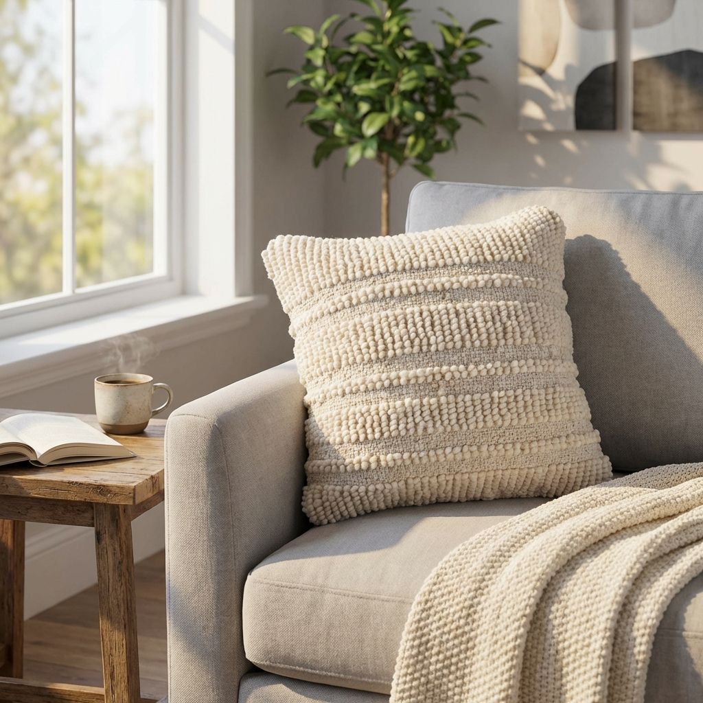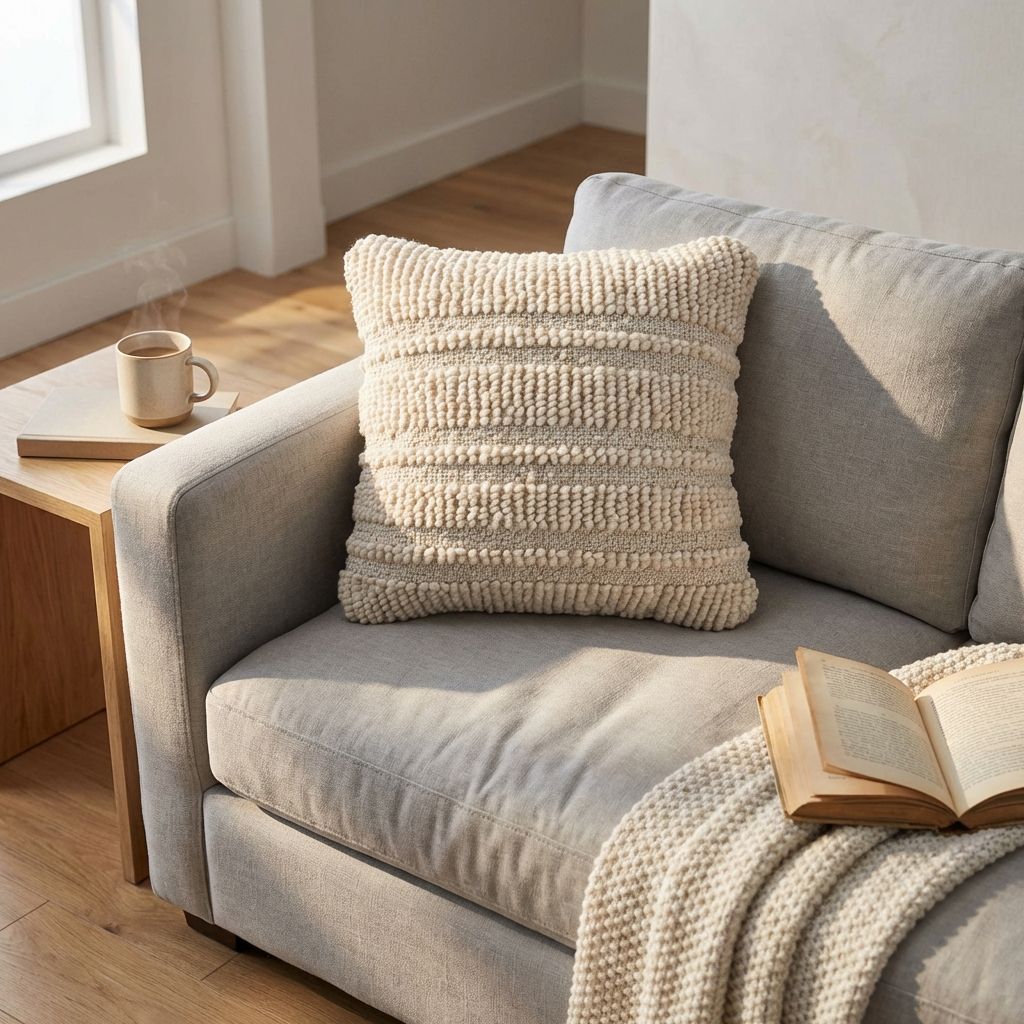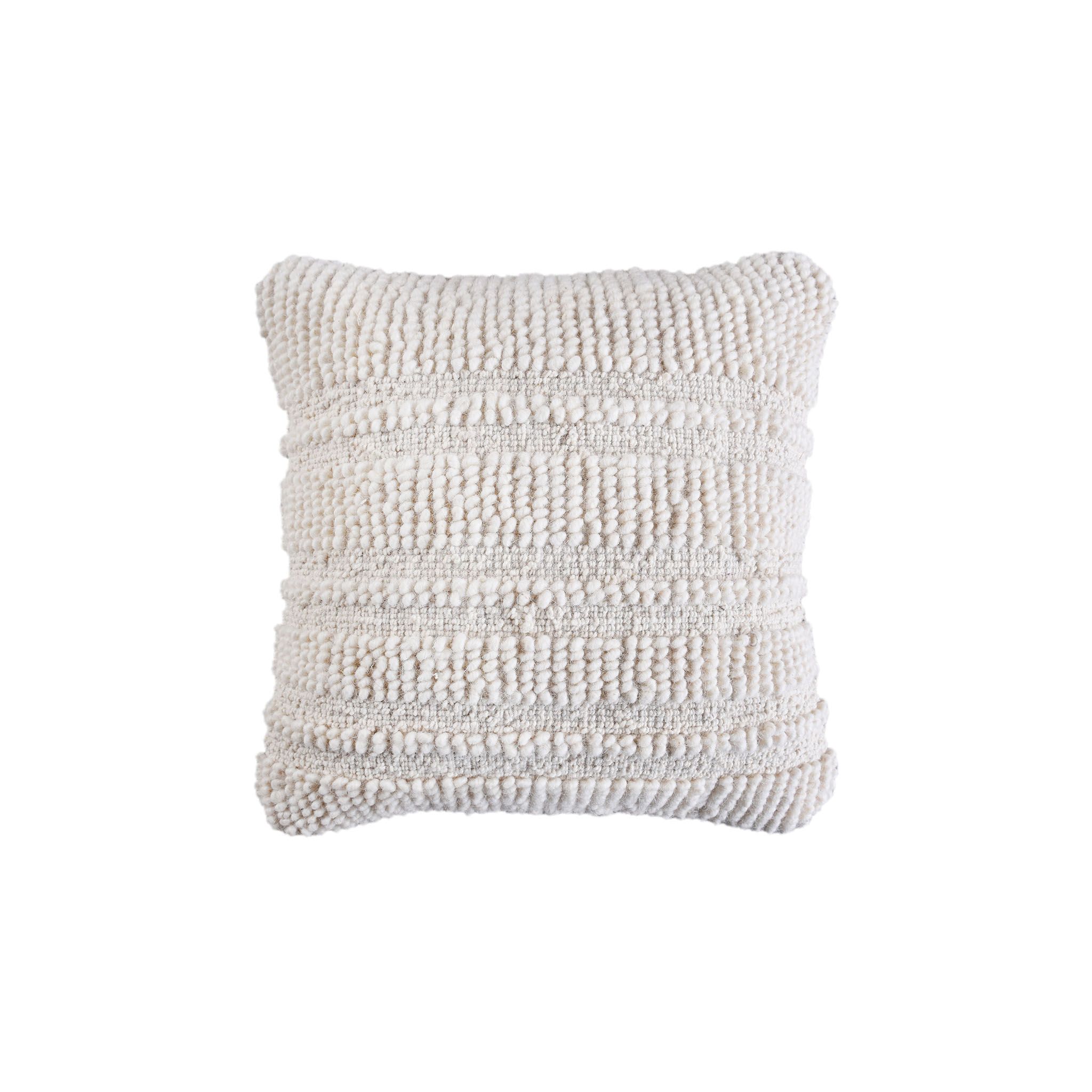 Cuscino decorativo con federa in lana, caratterizzato da texture materiche e lavorazioni in rilievo. Aggiunge un tocco di calore e personalità a divani, poltrone e letti. Il design naturale e neutro lo rende ideale per ogni ambiente.