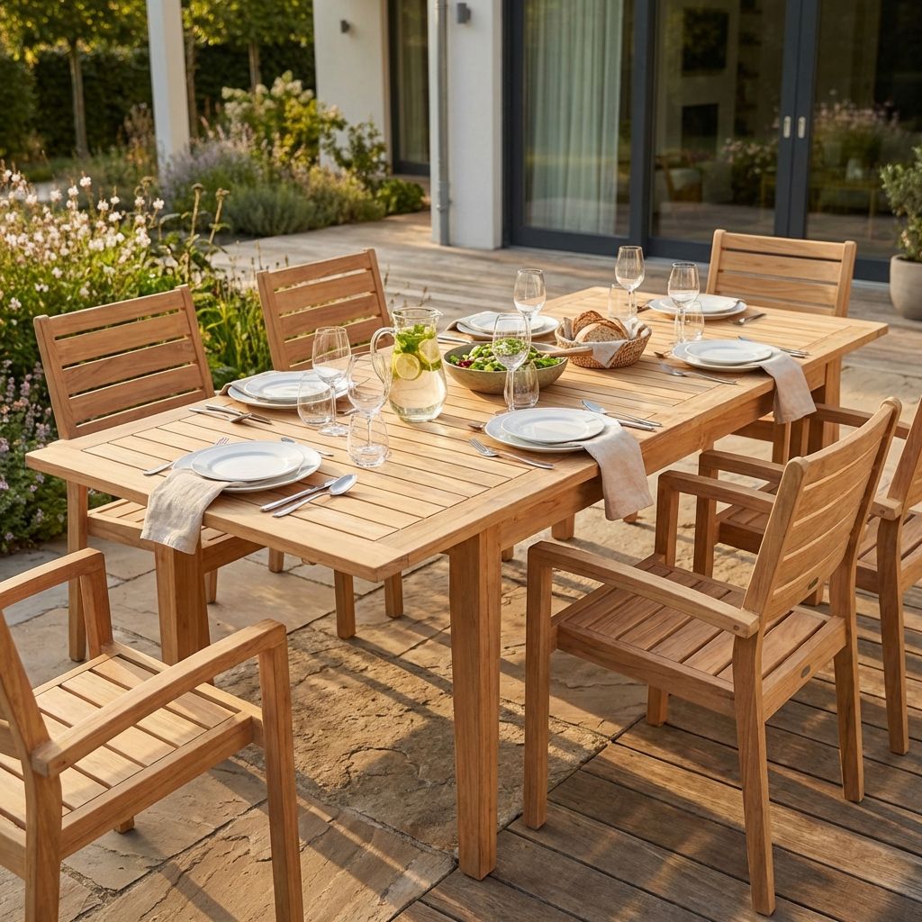 Il tavolo in teak TOBI è disponibile in dimensione 150x90 allungabile fino a 210 cm e in 200x100 cm allungabile fino a 300 cm
