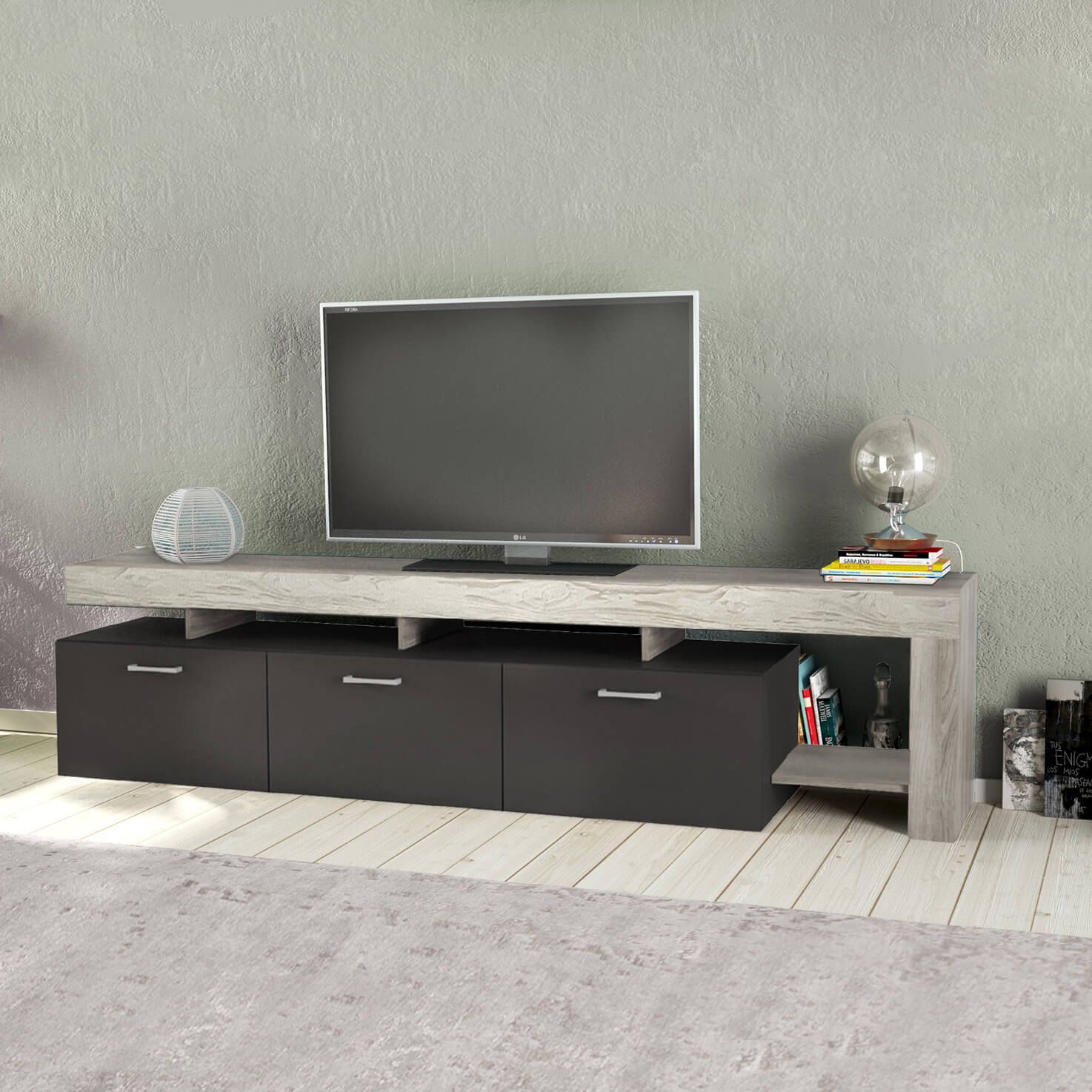 Il mobile TOKE è un porta tv disponibile in colore olmo, pino chiaro e cemento
