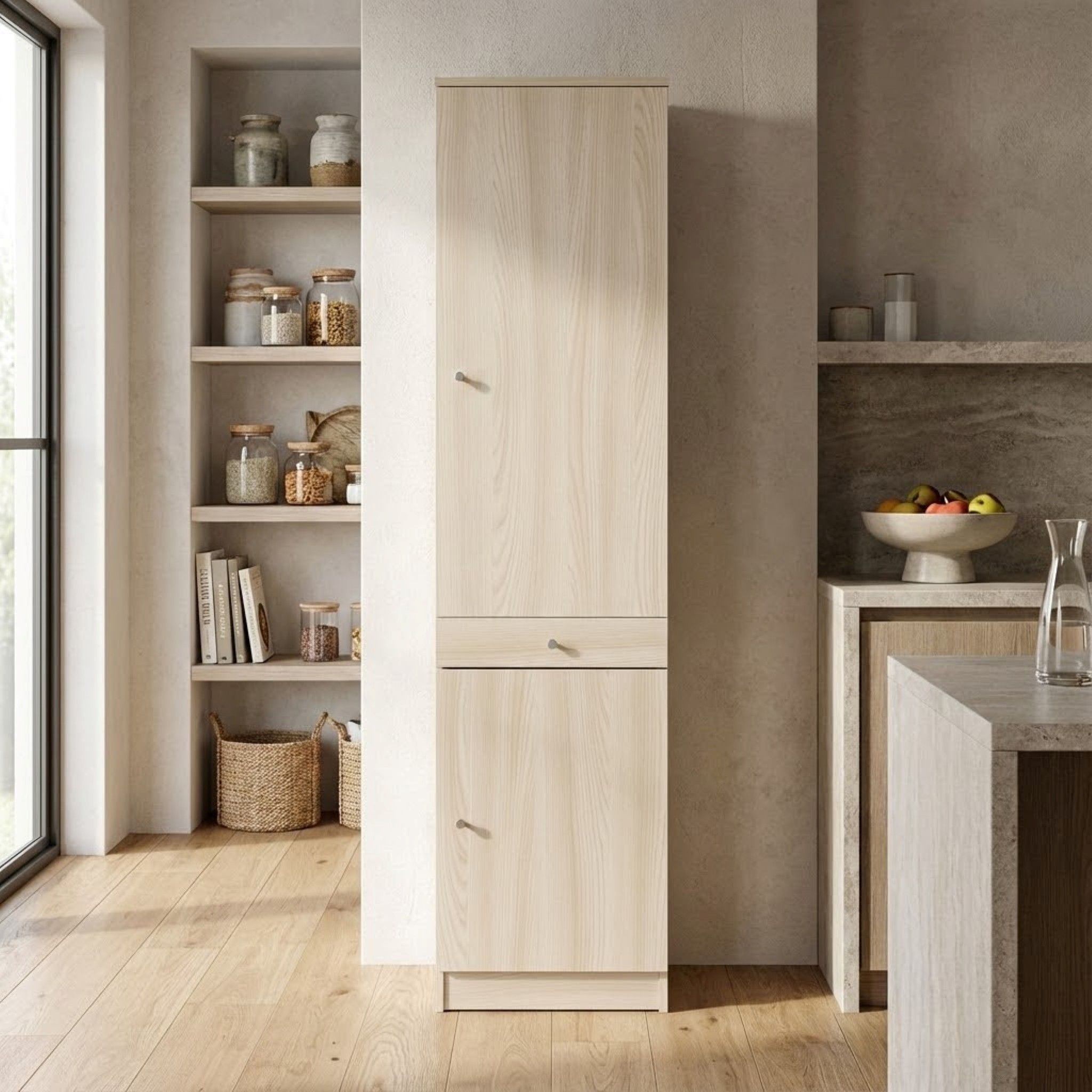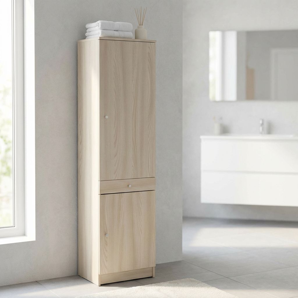 TRACK è un mobile colonna con due ante e un cassetto, perfetto per aggiungere un tocco di eleganza minimalista e massimizzare lo spazio verticale in qualsiasi ambiente. Disponibile nelle varianti Bianco liscio, Eucalipto ed olmo chiaro.