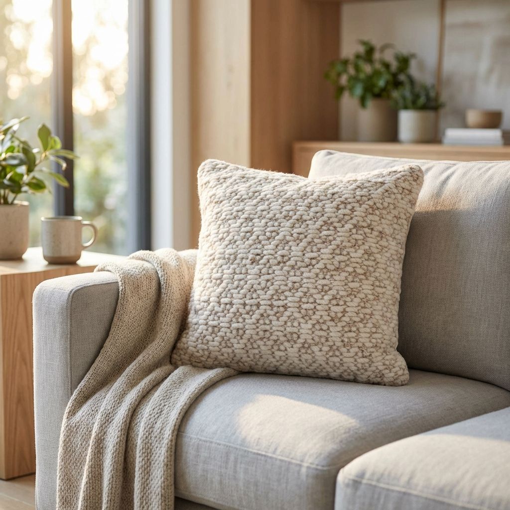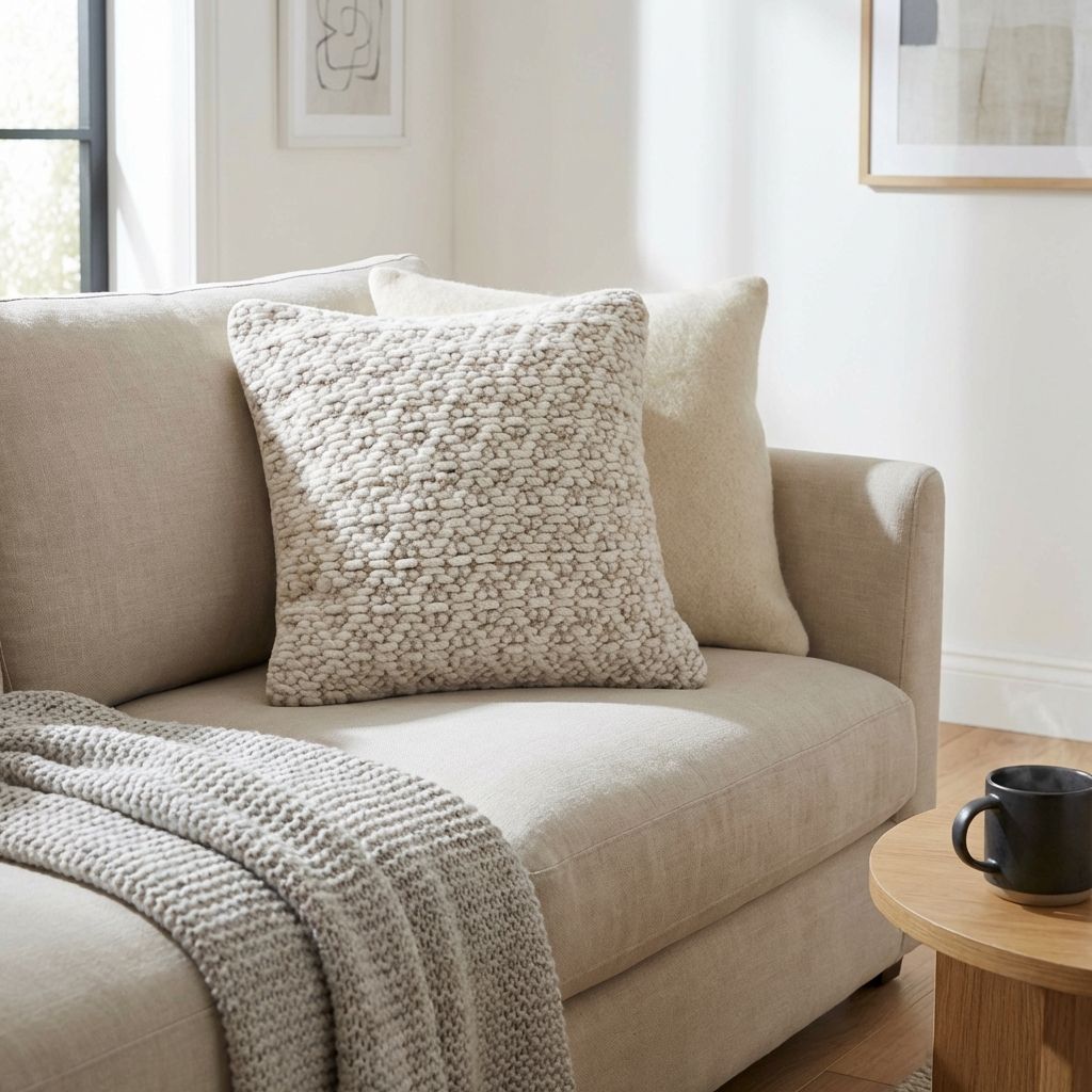 Cuscino decorativo con federa in lana, caratterizzato da texture materiche e lavorazioni in rilievo. Aggiunge un tocco di calore e personalità a divani, poltrone e letti. Il design naturale e neutro lo rende ideale per ogni ambiente.