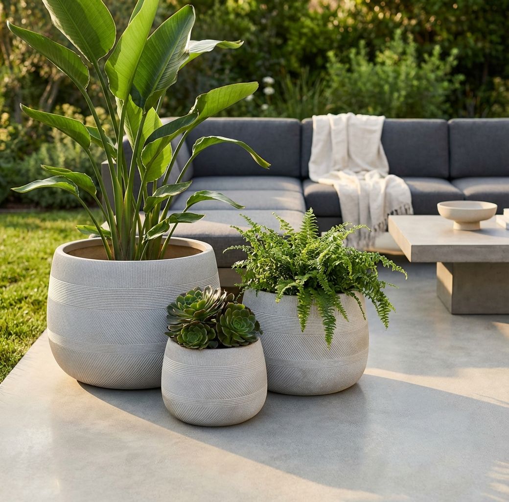 I vasi in fibra sintetica sono disponibili in grigio chiaro, grigio scuro e antracite. Perfetti per ambienti interni ed esterni, offrono resistenza e un tocco di modernità che valorizza ogni spazio.