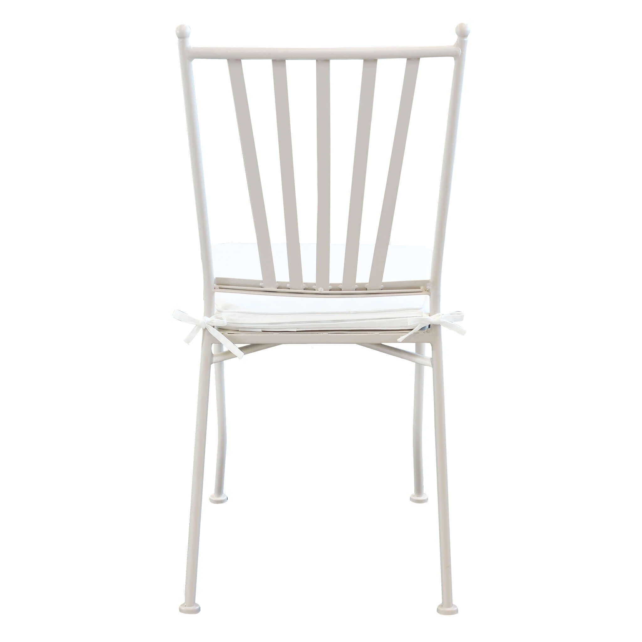Questa sedia da giardino, dallo stile classico ed elegante, è realizzata in acciaio verniciato per garantire una buona resistenza all'uso esterno. Il cuscino bianco incluso offre comfort e accoglienza. Perfetta per giardini, terrazze o portici, ma anche per sorprendere i clienti con la sua bellezza in attività commerciali.