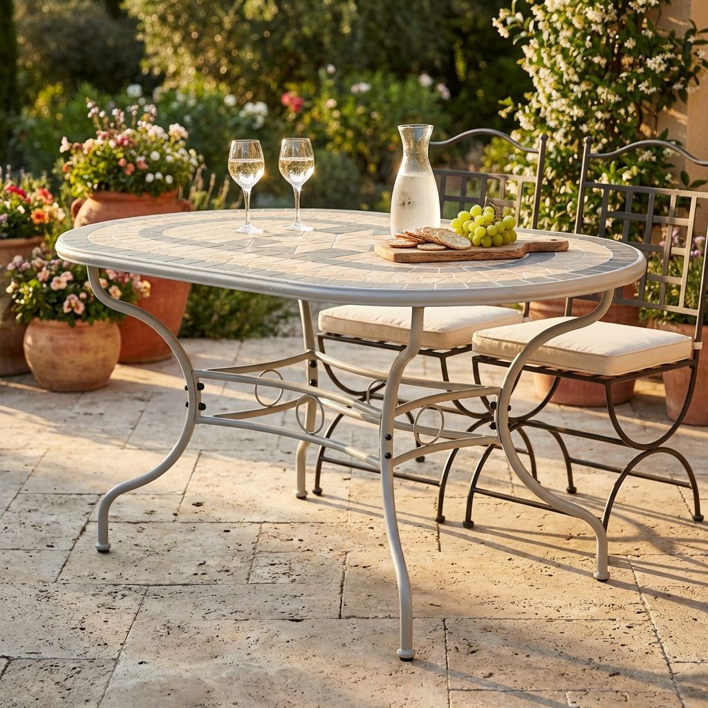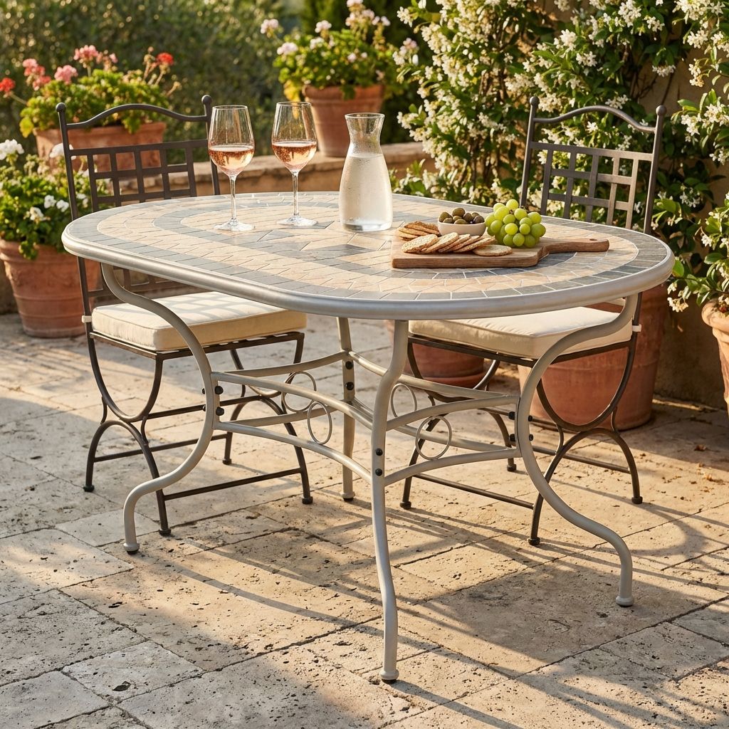 Il tavolo VENTUS in mosaico è disponibile in colore tortora e taupe, in forma ovale, quadrata, rettangolare e rotonda.