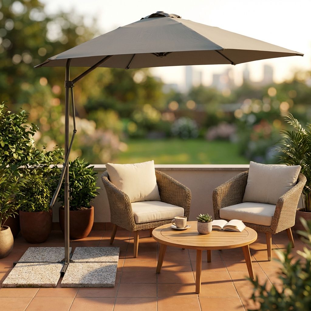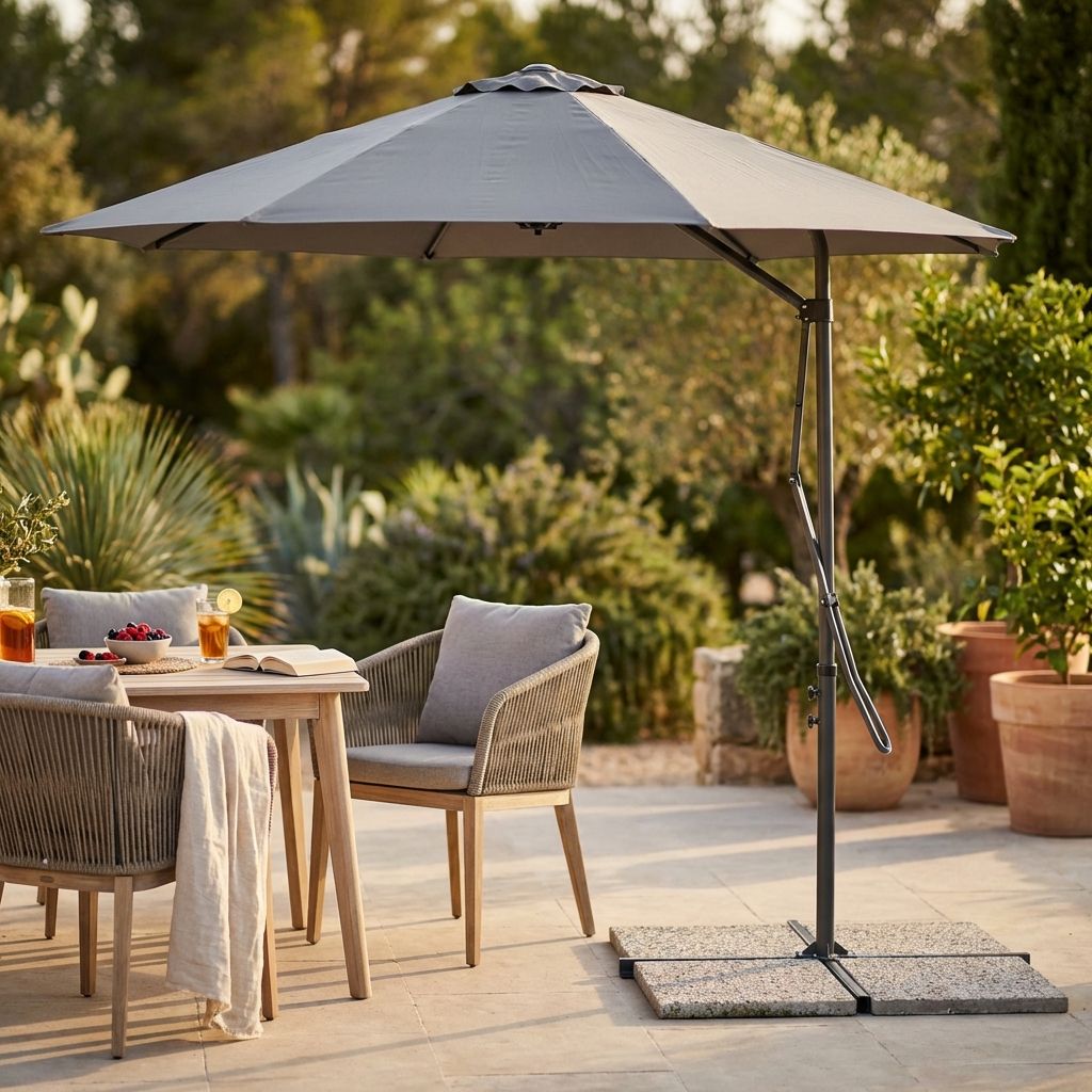 L'ombrellone VERSUS è disponibile in colore grigio o tortora, in dimensione 2x3 m, 2,5x2,5 m e in versione rotonda da 3 m di diametro