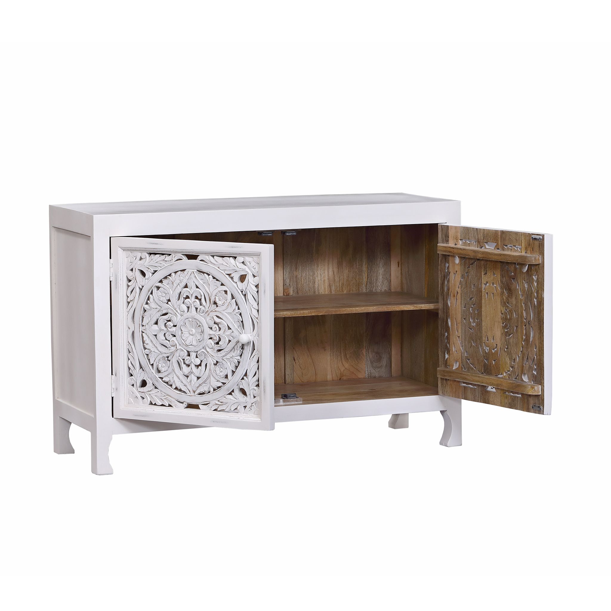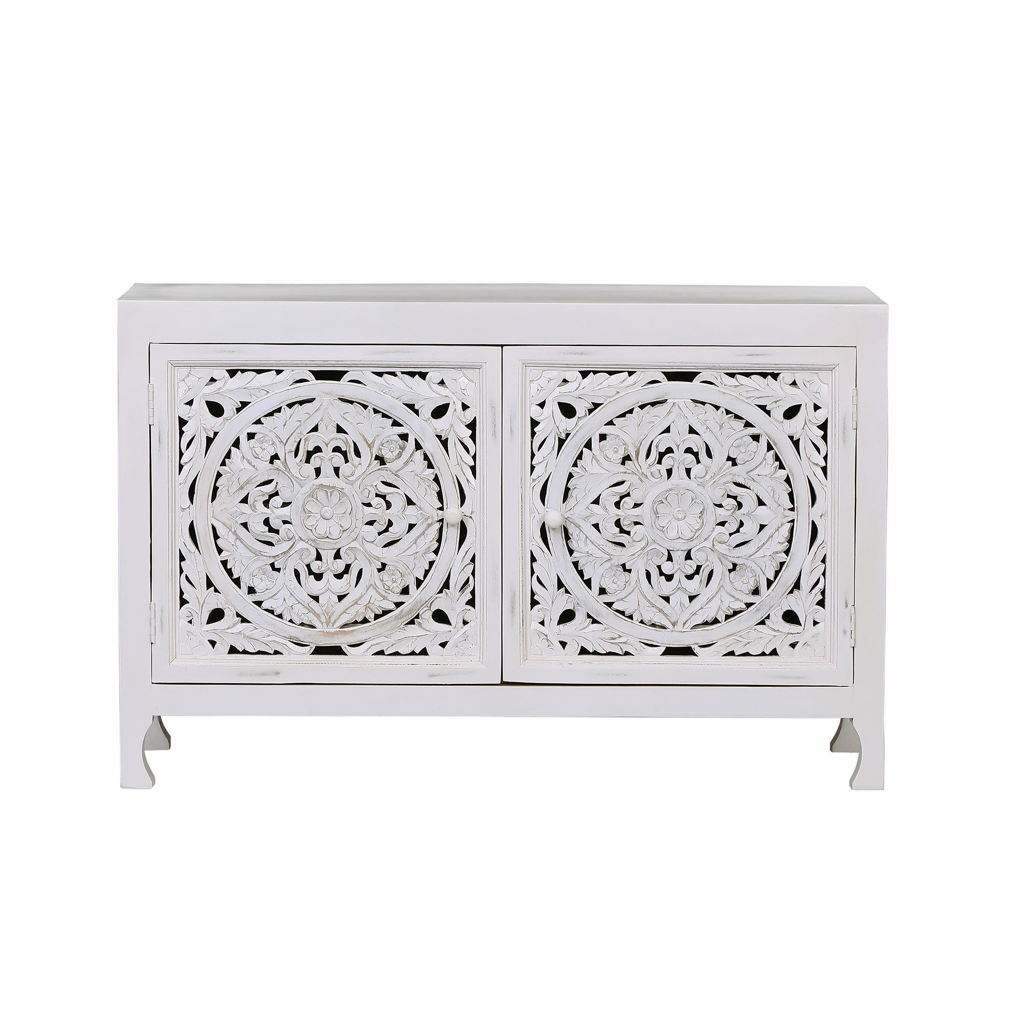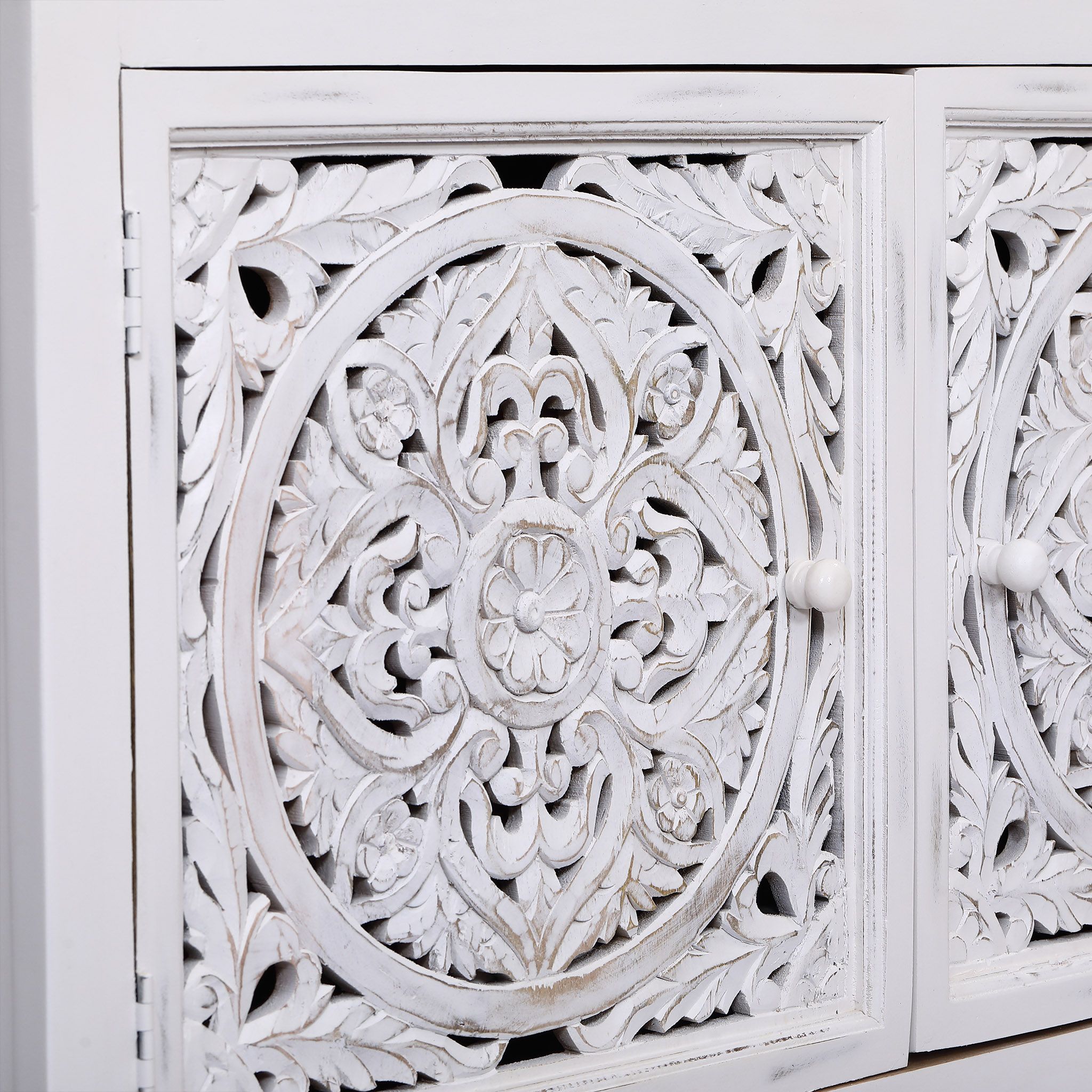 Questo mobile in legno di mango con due ante intagliate è un perfetto mix di eleganza e praticità. La lavorazione artigianale a motivi floreali e la finitura bianca decapata donano un tocco vintage e sofisticato. Con ampio spazio interno e struttura resistente, è ideale per arredare soggiorni, ingressi o camere con charme e funzionalità