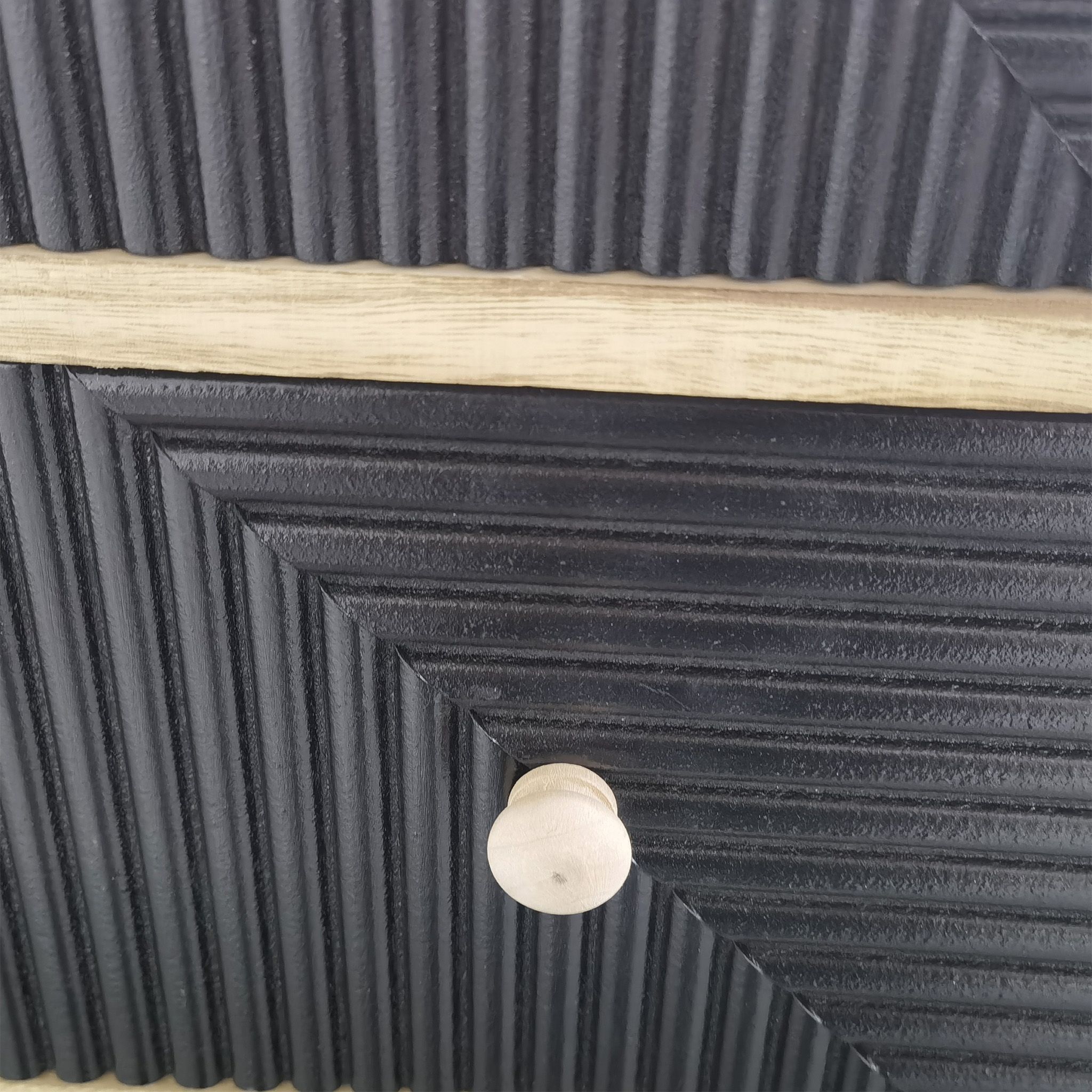 Compatto ed elegante, questo mobiletto in legno combina funzionalità e originalità. I cassetti scanalati neri dal design geometrico creano un contrasto moderno con la struttura in legno naturale. Perfetto per valorizzare camere, ingressi o salotti