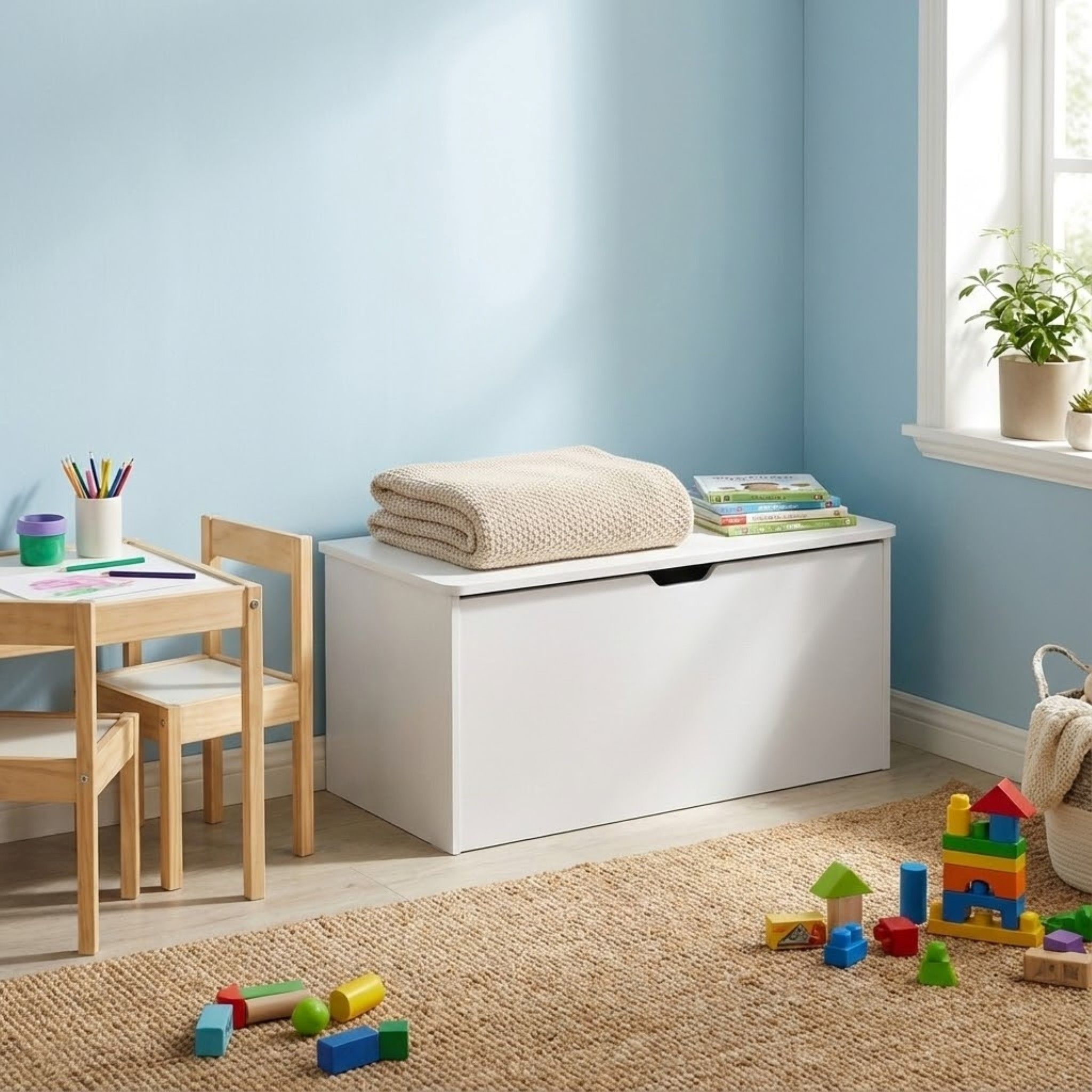 Pratico e moderno porta giochi in legno truciolare con finitura bianca e apertura a ribalta. Capiente e facile da inserire in qualsiasi ambiente, è perfetto per mantenere la cameretta o il soggiorno sempre ordinati. Ideale per riporre giocattoli, libri o accessori, unisce funzionalità e stile in un unico arredo.test a